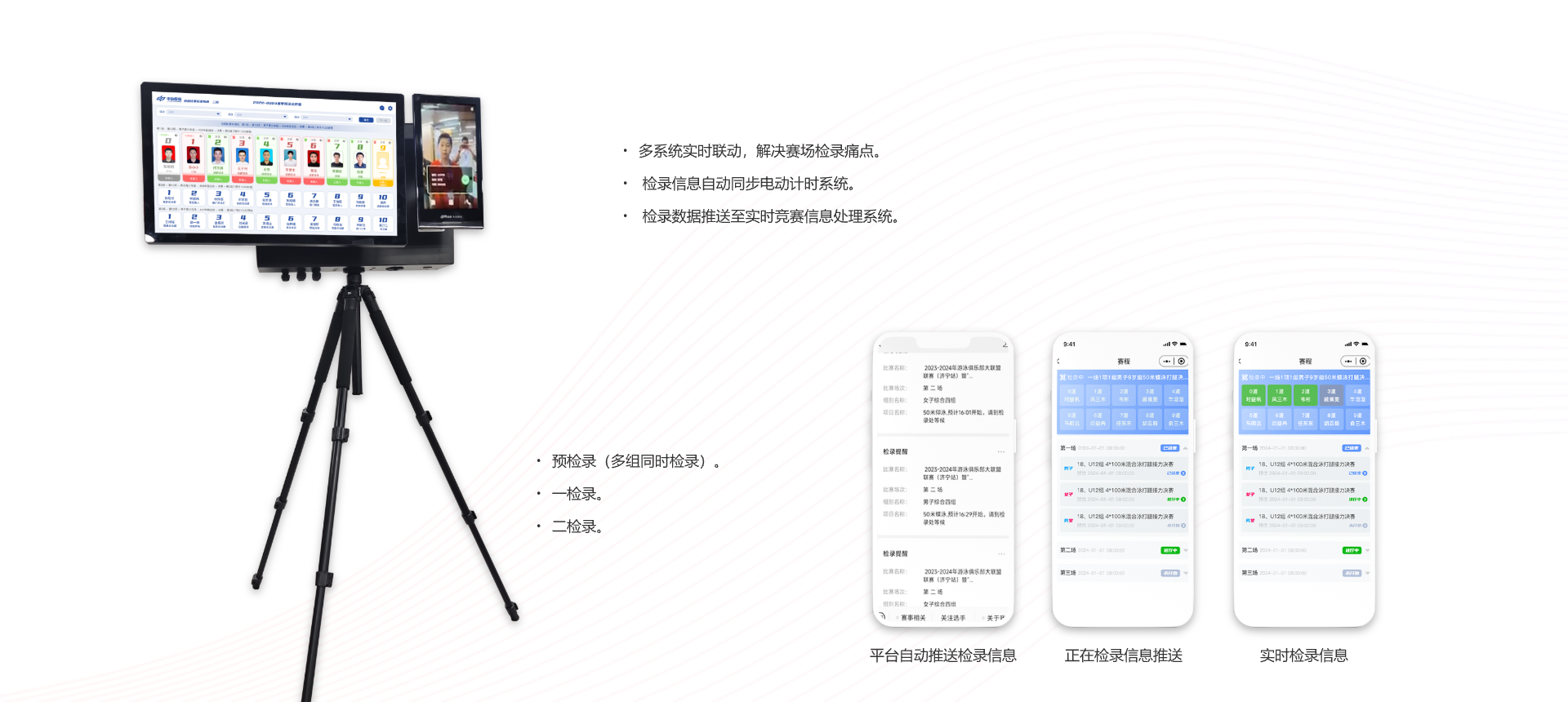 智能检录一体机通过人脸识别的方式对每一组参赛选手进行毫米级实时检录,检录完成后设备自动将检录信息推送至实时竞赛信息处理系统。