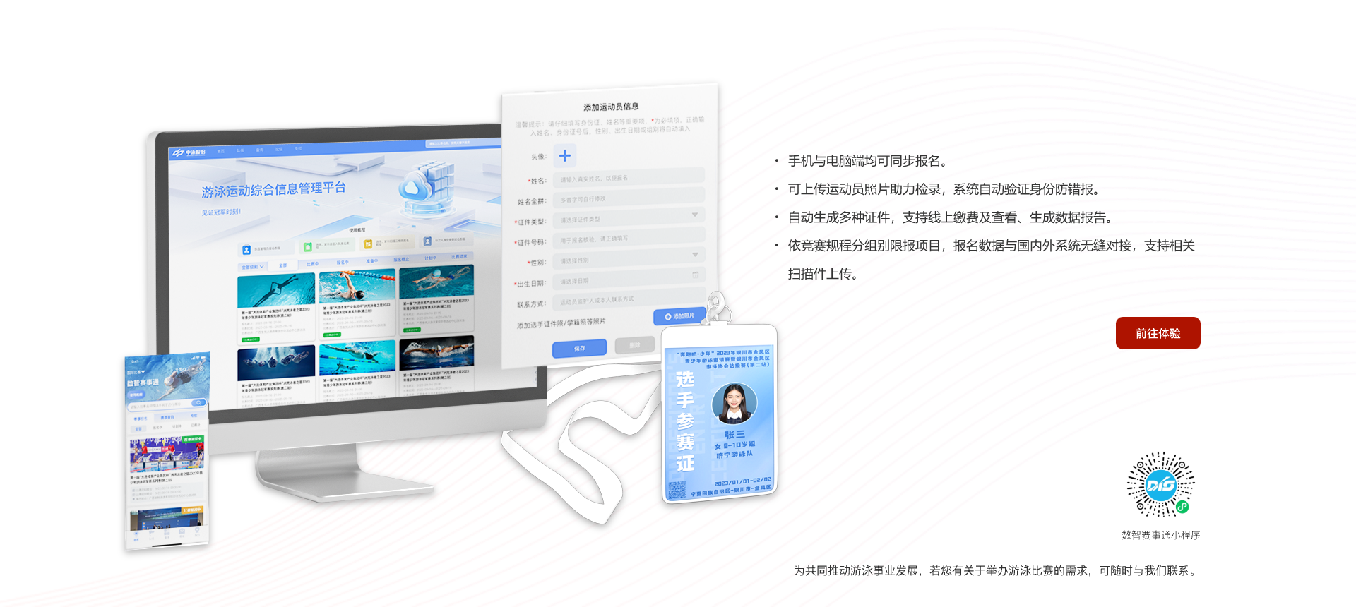 在报名方面,支持各层次游泳比赛,运动员可通过微信小程序和网页进行个人或团体报名,报名数据能无缝导入通用游泳编排系统,提升专业性与报名效率。查询功能上,可在手机 APP 查询竞赛秩序单、日程、项目、项目纪录、实时竞赛成绩、项目排名,还具备游泳单项成绩年度大排名及运动等级查询功能。此外,支持组委会发布赛事通知、图片和视频 。