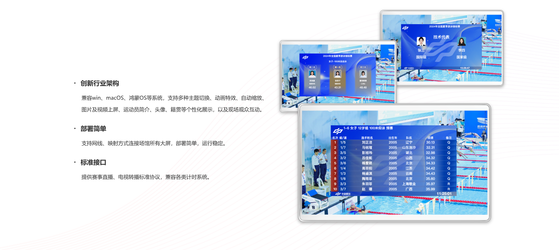 全新的大屏成绩发布系统兼容主流系统,支持主题切换、动画特效等个性化展示与现场观众互动,比赛成绩实时发布到现场大屏,部署方式简单,运行稳定,还提供赛事直播及电视转播标准协议且兼容各类计时系统。